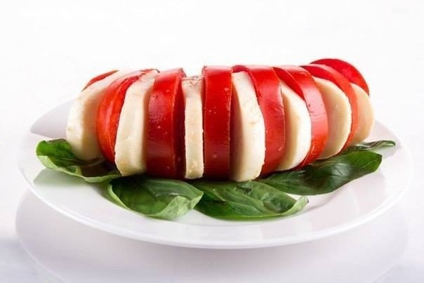 Знаменитый итальянский салат-закуску капрезе тоже можно подать оригинально. Для этого помидор не нужно резать на пластинки, а лишь надсечь его не до конца. В прорези вставить кусочки моцареллы. Для подачи необходимо посолить закуску по вкусу, сбрызнуть оливковым маслом и украсить листиками базилика.