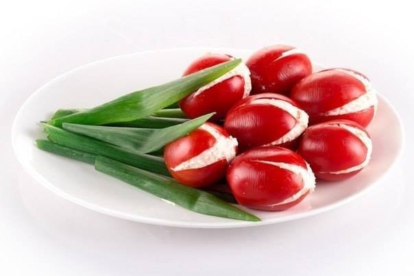 Для приготовления тюльпанов понадобятся удлиненные помидоры, например, сорта «сливка». В таком случае готовая закуска будет больше походить на настоящие цветы. Помидоры надрезать крест-накрест сверху. Аккуратно ложечкой извлечь мякоть и заполнить начинкой. В качестве начинки можно использовать 200 г творога, пробитого блендером со 100 г слабосоленой красной рыбы. Начинку следует посолить по вкусу. Такая начинка не только вкусна, но и содержит много белка, жирных омега-кислот, клетчатки и мало углеводов. В качестве стебельков тюльпанов можно использовать любую зелень, но лучше всего подойдет зеленый лук.