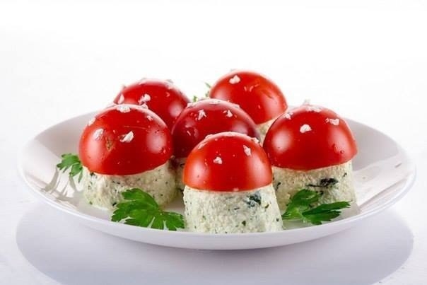 Многие делают «грибочки», используя вареные яйца и помидоры. Мы предлагаем сделать грибную «ножку» из творожной массы. Понадобится 200 г творога, 2 ст.л. сметаны, 1 щепотка соли, 10 листиков базилика или несколько веточек укропа. Зелень мелко нарезать, все ингредиенты смешать до однородности вилкой или с помощью блендера. По желанию можно добавить измельченный чеснок. Скатать влажными руками небольшие шарики и выложить их на тарелку. Помидоры разрезать пополам, накрыть половинками подготовленные шарики из творожной массы. Сметаной или майонезом сделать крапинки на шляпках.