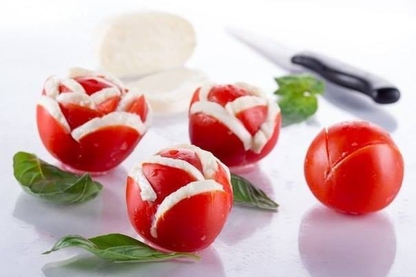 Для приготовления такой закуски хорошо подойдут помидоры небольшого размера, например, черри. Помидор необходимо надрезать с трех или четырех сторон, не дорезая до конца. Затем еще раз сделать такие же разрезы чуть меньшего размера ближе к центру. В зависимости от размера помидора повторять подобные действия можно два или три раза. Для того чтобы создать эффект «лепестков розы» в прорези нужно вставить тонкие кусочки сыра. Использовать можно любой сыр как твердых сортов, так и брынзу, сулугуни или моцареллу. При подаче можно украсить закуску листиками базилика или петрушки, посолить по вкусу и сбрызнуть оливковым маслом.