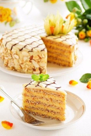 3. Сложить коржи друг на дружку перемазывая кремом. Так же смазать бока. Верхний корж не смазывать, и он должен быть самым ровненьким. Поставить торт в холодильник на пару часов минимум. Абрикосовый джем прогреть, протереть через сито. Покрыть верх торта. Опять в холод на 30 минут. Шоколад и сливки растопить на водяной бане, покрыть торт. С помощью растопленного черного шоколада и зубочистки сделать рисунок. Бока покрыть миндальными лепестками.