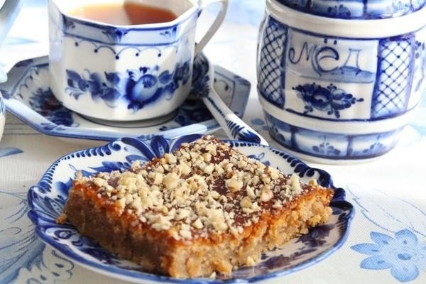 Сразу же, теплую, смазываем медом и посыпаем рубленными орехами. Даем немного остыть перед подачей.