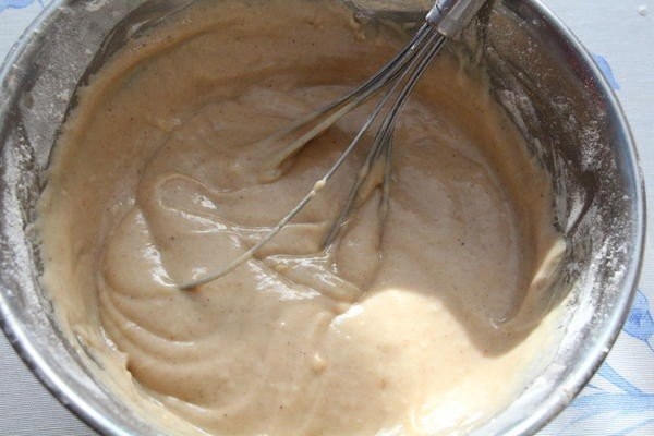 4. Ввести муку в жидкие ингредиенты и замесить тесто ( как густая сметана).