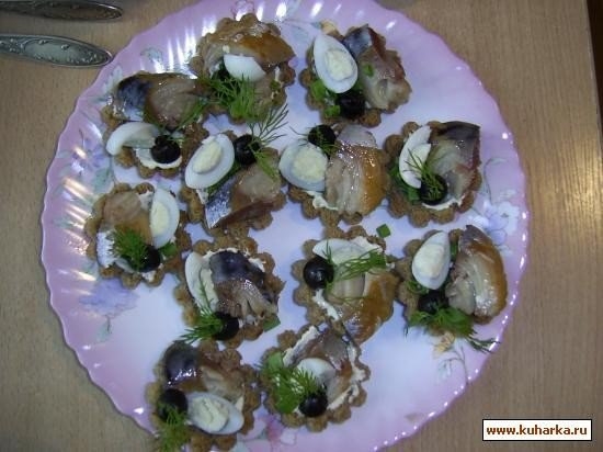 В 1 ст.л. майонеза добавляем 0,5 ч.л. сливочного хрена, пару капель лимонного сока и 0,5 ч.л. тертого яблока. На дно корзиночки кладем соус, посыпаем зеленым луком, укладываем кусочек селедки (у меня была скумбрия). Украшаем ломтиком перепелиного яйца, маслинами, зеленью.
