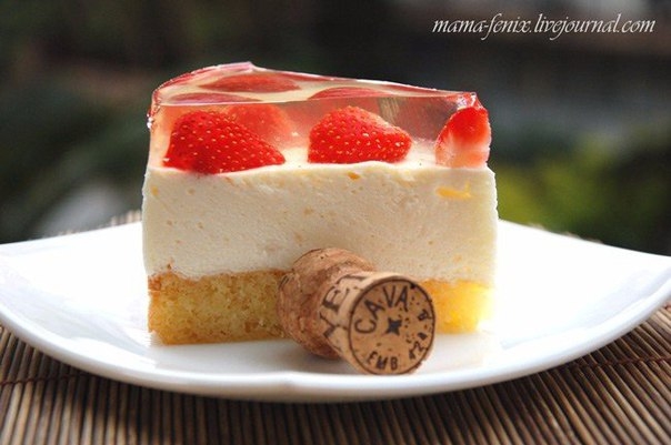Для желе: 100 г шампанского смешать с сахаром, добавить лимонный сок, нагреть до полного растворения сахара, добавить заранее замоченный и отжатый желатин. Влить оставшееся шампанское, остудить. В форму меньшего диаметра чем та, в которой будет готовиться торт, выложить нарезанную на четвертинки клубнику, залить желе слоем 2,5-3 см, дать застыть несколько часов. Оставшуюся жидкость оставить, она понадобится для глазирования торта.