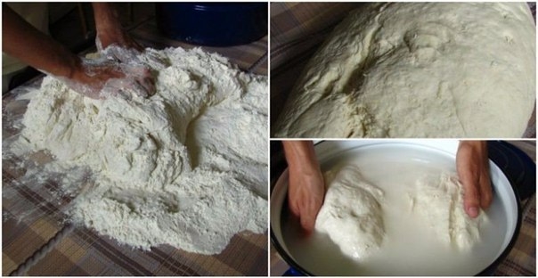 10. Дальше, для удобства работы, тесто разделяем на две части. Каждую часть разминаем в воде. Крахмал вымывается из теста, и вода приобретает белый цвет. Иногда воду сливаем и добавляем свежую. Продолжаем разминать.