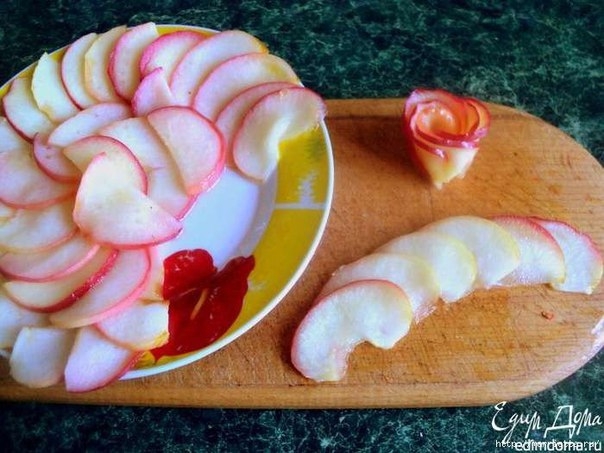 Для украшения яблоки лучше брать краснобокие, тогда розочки получатся яркие и красивые. Яблоки разрезать пополам, удалить семена и нарезать пластинками толщиной 2 мм. Из сахара, воды и лимонного сока сварить сироп. Порциями проваривать в сиропе пластинки яблок буквально несколько секунд, пока они станут мягкими, но не переварятся. Выложить пластинки яблок на тарелку, чтобы стек сироп. Затем свернуть из яблок розочки.