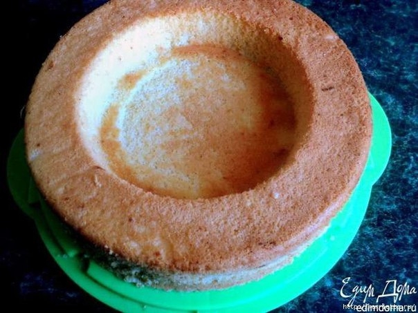 Для выпечки бисквита я использовала форму с дном, имеющим выемку. Если такой формы нет, можно использовать обычную разъемную форму и вырезать у готового бисквита серединку.