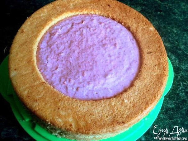 Вылить суфле в выемку на бисквите и поставить торт холодильник на 2 часа для застывания суфле.