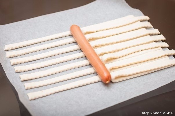 В центр теста, у самого сгиба, положить венскую сосиску.