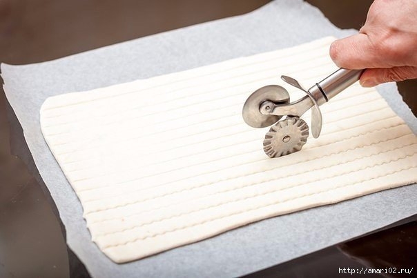 Пласт теста немного раскатать в одном направлении, превращая квадрат в прямоугольник. Разрезать тесто по длине на полоски произвольной ширины.