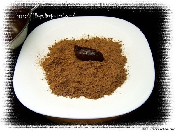 Насыпать на тарелку порошок какао, и когда масса застынет и будет консистенции пластилина, брать понемногу ложкой и присыпав какао формировать шарики или пирамидки.