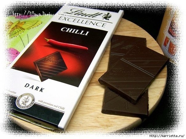 Если нет шоколада с чили, то можно взять обычный черный и добавить порошок сухого чили. Главное не переборщить)))