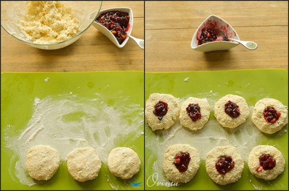 На лепешки выкладываем фарш из варенья, изюма и кураги.