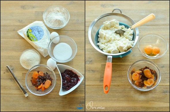 Сначала дадим стечь лишней жидкости из творога, поместив его в сито, а затем протрем его через это сито. Замочим в теплой воде изюм и курагу. Варенье увариваем до загустения.