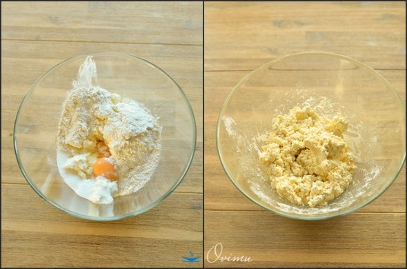 В большой посудине соединим творог, муку, сахар, ваниль, два желтка от яиц. Хорошо перемешиваем.
