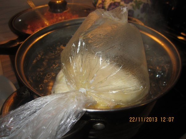 Пакет закрыть клепкой от хлебного пакета, привязать к ручке кастрюли . Готовить минут 15 получится очень интересный диетический омлет. Конечно, такой омлет в приготовлении займет немного больше вашего времени, но поверьте вы не пожалеете !!!!Это очень вкусно!!!