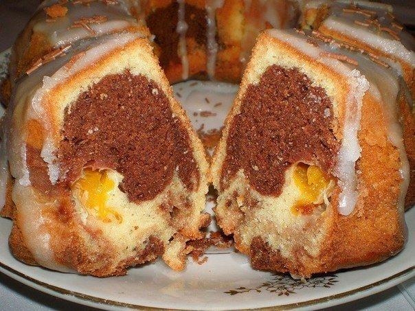 Возьмите вилку и для получения мраморного рисунка, аккуратно проведите по тесту, как бы смешивая его слои. Выпекайте кекс около часа при температуре 180 градусов.