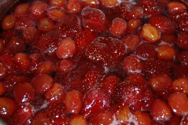 Варим клубничное варенье. Оно должно дойти до кипения, затем собираем пенку, варим около 10 минут и оставляем остывать. Нужно сделать три-четыре таких подхода.