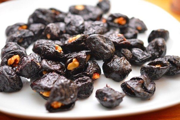 3.Пока шоколад тает, займитесь черносливом. В каждую ягоду на место косточки вставьте орех подходящего размера.