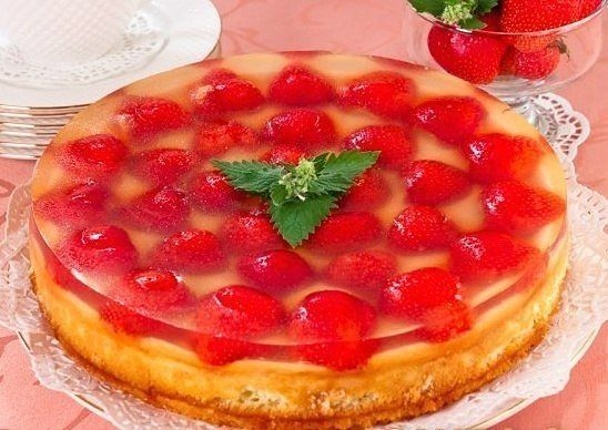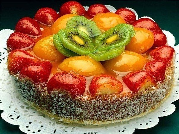 5. Фрукты и ягоды для украшения пирога промываем и нарезаем крупные из них. Достаём пирог из формы и перекладываем его на блюдо. Корж намазываем кремом и на крем раскладываем кусочки фруктов и ягоды. Заливаем пирог желе и отправляем застывать в холодильник минимум на полчаса.