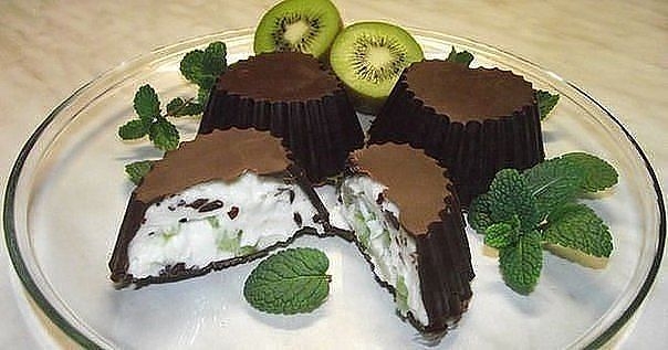 Извлечь из морозилки формочки и наполнить их начинкой,поочередно выкладывая творог и фрукты. Смешать творог с фруктами,если нет желания делать слои.Начинка должна быть почти до самого края.Сверху заливаем и разравниваем шоколад.Отправляем все в морозилку.