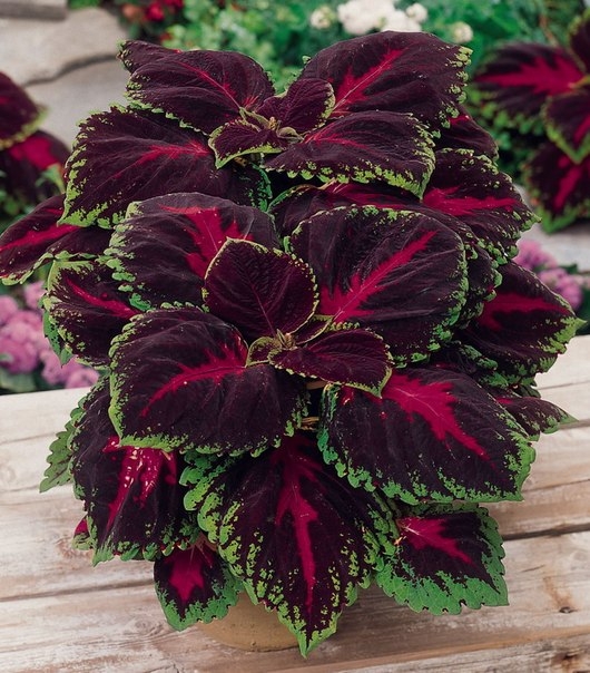Колеус привычен для нас в качестве комнатного растения, однако он не менее эффектен в уличных цветочных композициях. Очень прост в выращивании, если следовать простым правилам ухода. Летом это растение колеусы требует обильного полива.