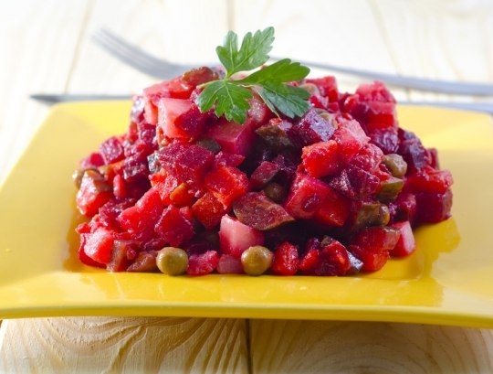 1. Вареные овощи очистить и нарезать на кубики одинакового размера.