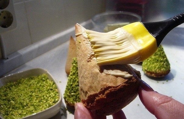 Бисквиты кисточкой тонким слоем обмазать шоколадом и обвалять в дробленых фисташках.
