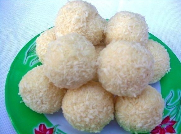 Немного подправь его, чтоб форма была ровной и можно обкатывать в сухом кокосе