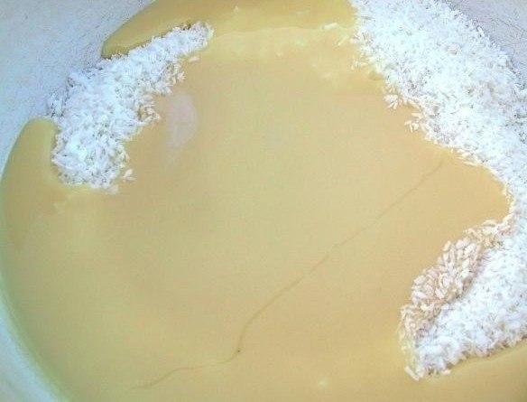Высыпь в глубокую миску кокосовую стружку и вылей туда же сгущенку.