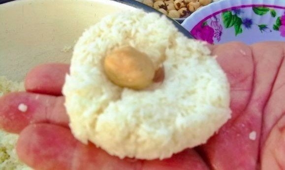 Из сладкой кашици руками сделай лепешечку, в середину укложи орешек и, сжимая ладонь, получи шарик.