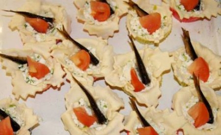 Закуска в слоеном тесте с творожно-сырной начинкой и шпротами