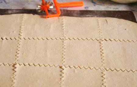 Тесто раскатываем в тонкий пласт и разрезаем на 12 примерно одинаковых квадратов.