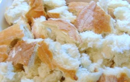 Форму для запекания смазываем маслом и выкладываем хлеб, рванными кусочками.