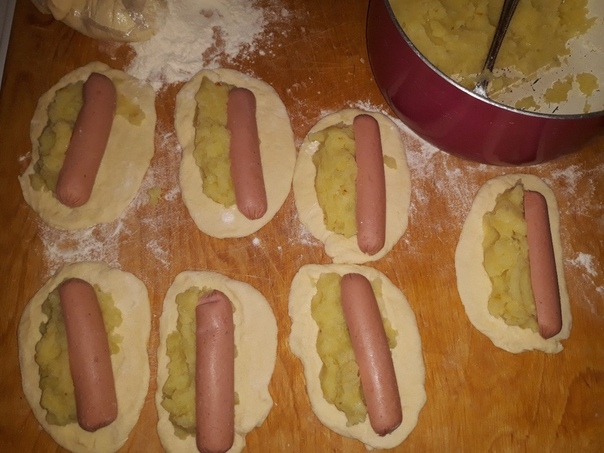 Три средних картошки отварила, лук пожарила на сл.масле, добавила в картошку мятую, соль, перец. Сосиски пополам! Тесто дрожевое сдобное. Смазать яйцом и в духовку на 15 мин. Из 7 сосисок получилось 14 пирожков!