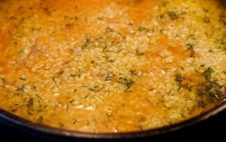 Добавляем промытый рис, мелко порезанный укроп и горячую воду, так чтобы жидкость едва покрывала продукты. Делаем маленький огонь и готовим под крышкой 30 минут.