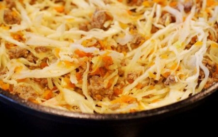 Лук мелко режем, морковь трем на терке. Обжариваем в глубокой сковороде. Затем добавляем фарш, специи, перемешиваем и жарим вместе еще минут 15.