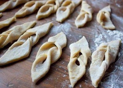 Вергуны "Бабушкины" ингредиенты В кастрюлю с толстым дном налить масло подсолнечное и хорошо прогреть. Из теста сформировать плюшки и внутри сделать разрез, продеть один край плюшки через отверстие, получаются узелки.