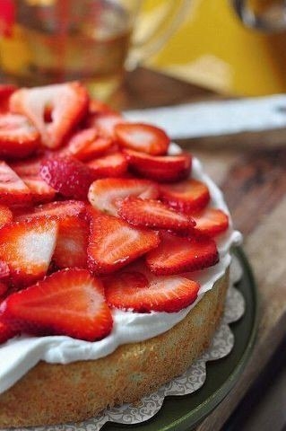 Выложите на блюдо первый корж и смажьте его ромовым сиропом. Выложите часть взбитых сливок, распределите равномерно, разложите нарезанную клубнику и закройте еще одной порцией сливок.