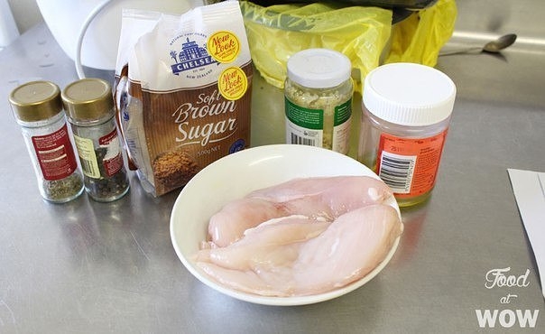 • Распределите смесь чеснока и коричневый сахар на куриные грудки.