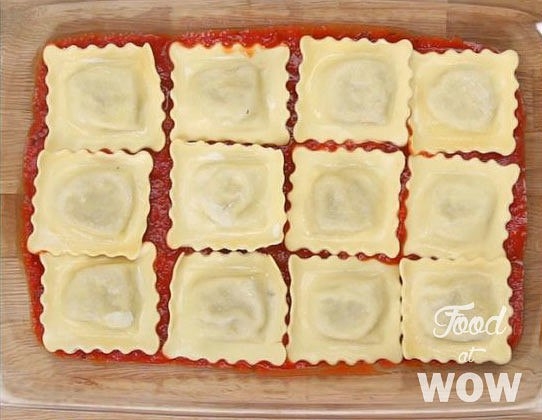 3/4 стакана пасты с соусом наливаем в форму для запекания. Затем положите половину замороженных пельменей в один слой над соусом и полейте оставшимся соусом и после этого все посыпьте сыром Моцарелла. Повторите слои еще раз, начиная с равиоли и посыпьте сыром Пармезан.