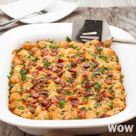 • В миске вручную взбейте вместе молоко, яйца, перец, луковый порошок и соль. После смешивания, полейте этой смесью сыр и колбасу в форме для запекания. Сверху выкладываем замороженные картофельные шарики.