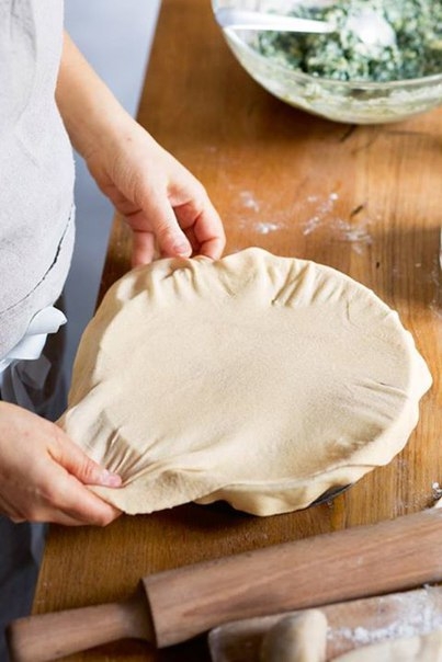 Изделие присыпать оставшимся пармезаном и сливочным маслом и накрыть меньшими пластами теста, промазывая их оливковым маслом. Свисающие края изделия приподнять, завернуть друг на друга и плотно защипать.