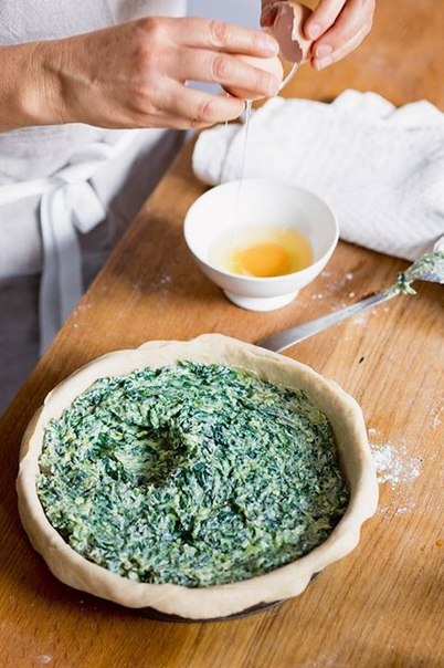 5. Выложить на сковороду нашинкованную зелень и, регулярно помешивая, готовить, пока листья не опадут и не выпарится большая часть влаги (ок. 15 мин). Подмешать петрушку и снять с огня. Дать массе немного остыть, добавить рикотту и 60 г пармезана, вбить 2 яйца и хорошо перемешать.