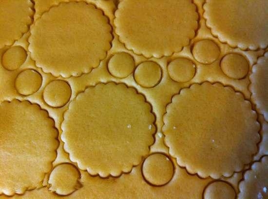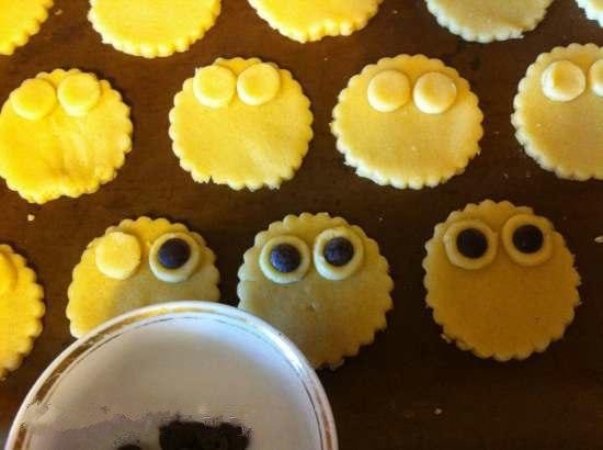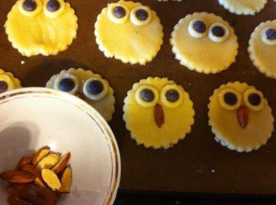 Размягченное масло взбить с сахаром, ванильным сахаром, солью и лимонным соком, постепенно всыпая муку. Тесто должно собраться в шар. Охладив его в течение получаса в холодильнике, раскатываем на присыпанной мукой поверхности и вырезаем заготовки - по две маленьких на каждую большую. Раскладываем кружочки на листе для выпечки, на каждый кладем, слегка смочив водой нижнюю поверхность, по будущему глазику и вдавливаем в каждую "глазницу" (уж простите) по зрачку - шоколадной капле. Теперь так же прикрепляем клювики - половинки миндаля. И вилкой выдавливаем рельеф лапок и крыльев.
