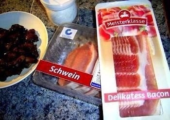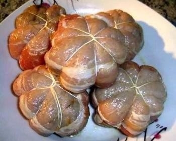 Обертываем мясной шар по периметру ломтиком нарезки бекона или длинным тонким ломтиком сала.
