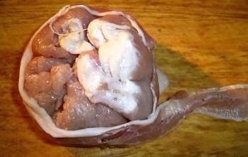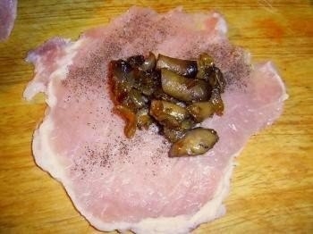 Пласт мяса посыпаем солью и перцем и на середину выкладываем начинку.