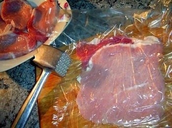 Каждый ломтик мяса кладем в пакет и отбиваем как можно тоньше, чтобы получить тонкий пласт.