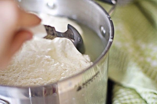 3. В процессе нагревания жидкость в кастрюле начнет разделяться на сыворотку и творог.